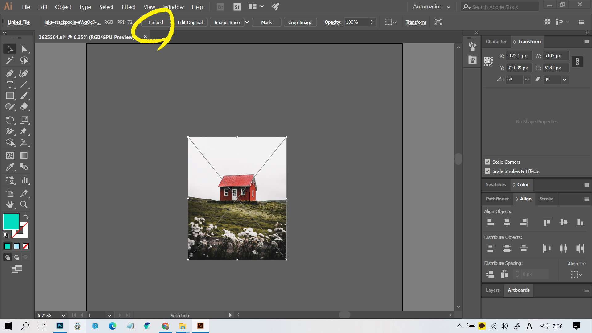 사진 파일을 불러오면 Embed를 눌러서 이 파일이 일러스트 파일화? 되도록 해준다.